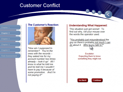 In this example, students choose the correct or incorrect response. Based on the choice, the student receives detailed feedback that reinforces the content.